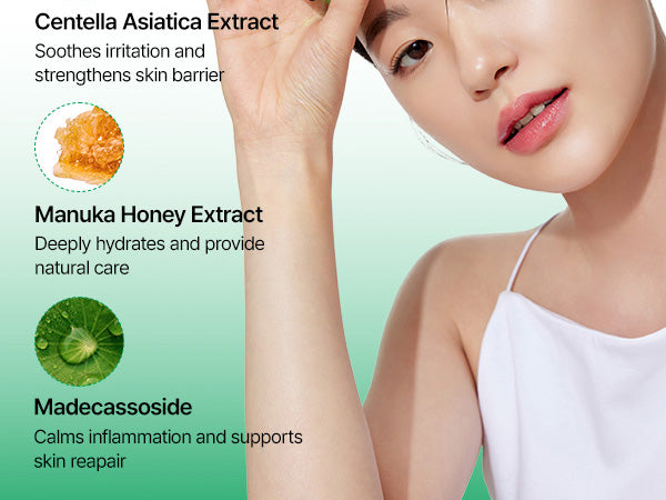 Water,Butylene Glycol,Glycerin,1,2-Hexanediol,Carbomer,Tromethamine,Polyglyceryl-10 Laurate,Propanediol,Melia Azadirachta Leaf Extract,Centella Asiatica Extract,Theobroma Cacao (Cocoa) Seed Extract,Ethylhexylglycerin,Artemisia Vulgaris Oil,Melia Azadirachta Flower Extract,Dextrin,Disodium EDTA,Sodium Polyacrylate,Pentylene Glycol,Coptis Japonica Root Extract,Lactobacillus Ferment,Leptospermum Scoparium Leaf Extract,Madecassoside,Decyl Glucoside,Caprylyl Glycol,Honey Extract,Limnanthes Alba (Meadowfoam) Seed Oil,Caprylic/Capric Triglyceride,Olea Europaea (Olive) Fruit Oil,Hydrogenated Lecithin,Ceramide NP,Phytosphingosine,Melatonin
